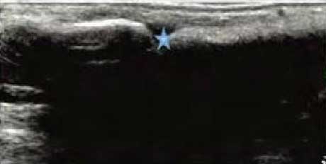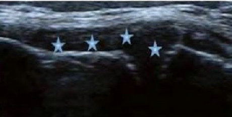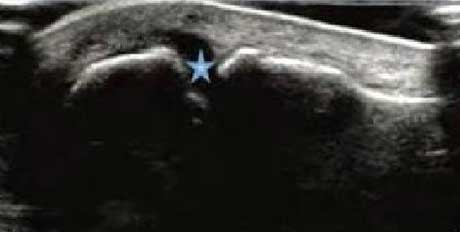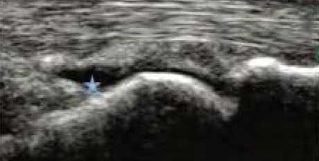 类风湿关节滑膜炎症会导致滑液渗出不断增多,形成关节腔积液。肌骨超声少可发现1ml的积液,能对关节腔积液量及位置准确定位,通过检测判定关节腔内液性边界清楚的无回声区、细点状回声或细微的低回声条纹,判断其宽度和深度衡量积液量的多少,进而评估RA的严重程度。