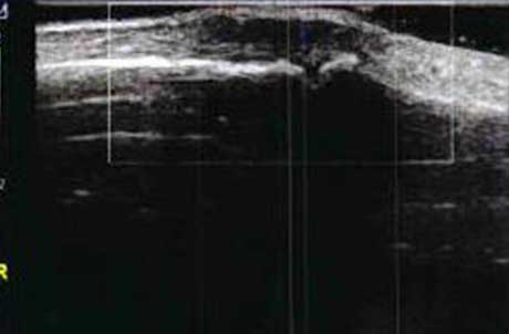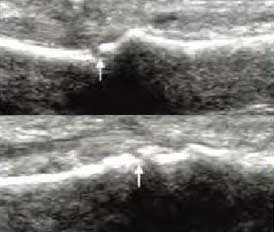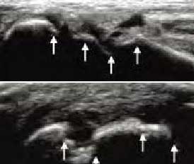 类风湿性关节炎以滑膜炎为基本病理改变,超声可观测到关节暗区的范围及厚度,判断有无滑膜增厚、显示不同程度的滑膜均匀或不均匀增厚,分辨滑膜呈绒毛状、团状或结节状结构向关节腔突起的形态。通过对滑膜厚度、水肿、炎性细胞浸润状况的分级、定量评估RA关节内滑膜的炎性程度。